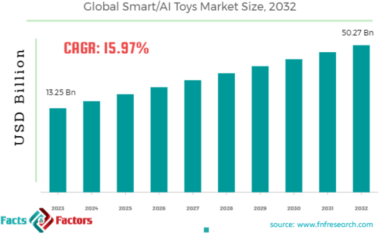 方今,AI玩具市集已吵杂杰出,吸引着各方眼光。据Facts Factors揭晓的数据,2023年环球AI玩具市集领域一经抵达132.5亿美元,这一数字到2032年希望横跨502.7亿美元将横跨300亿元,估计2024年至2032年岁月复合年增加率为15.97%。