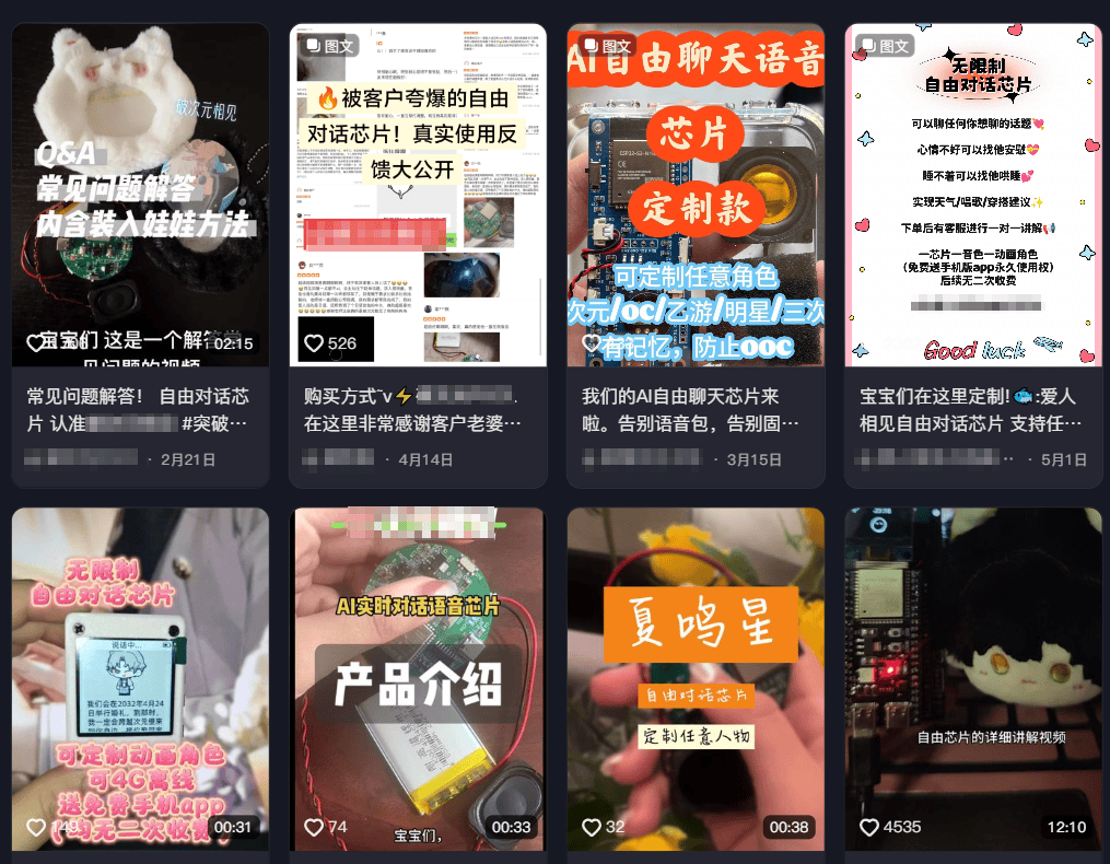 旧年 12 月,团队推出的首款芯片以热门乙女逛戏男主为原型。固然前期扩充功效平淡,每天仅售出 1-2 单;但一个月后电子玩具,跟着小智 AI 开源、Deepseek 等手艺发作,市集缓慢升温,流量与订单激增,竞品也随之展示。